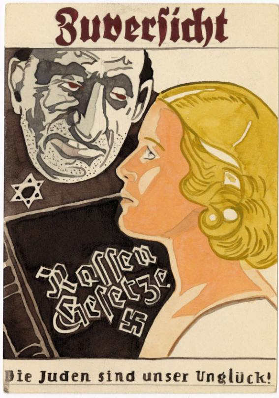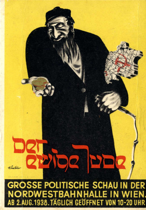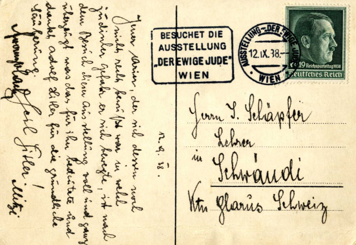 Promotional postcard from Vienna advertising the anti-seminitic Der ewige Jude [The Eternal Jew] propaganda exhibit,1938. The postcard is postmarked and includes a handwritten note.